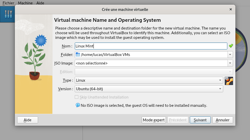 Une autre fenêtre s’ouvre pour nous permettre de configurer une nouvelle machine virtuelle. Commencez par entrer le nom de votre machine, pour cet exemple on écrira “Linux Mint” pour que VirtualBox puisse automatiquement définir les bonnes options à paramètrer pour Linux Mint. Vérifiez que les cases Type et Version affichent respectivement “Linux” et “Ubuntu (64-bit)”. Ensuite, cliquez sur Suivant.