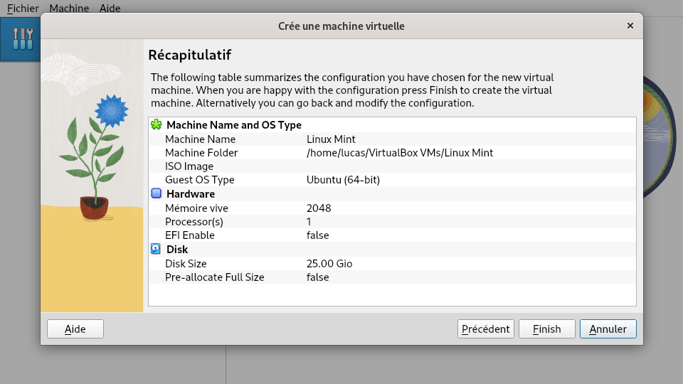 Laissez toutes les options par défaut dans les fenêtres suivantes. Cliquez à chaque fois sur Suivant, puis la dernière fois, sur Finish. Ça y est la machine virtuelle est prête, il ne reste plus qu’à installer Linux Mint dessus !