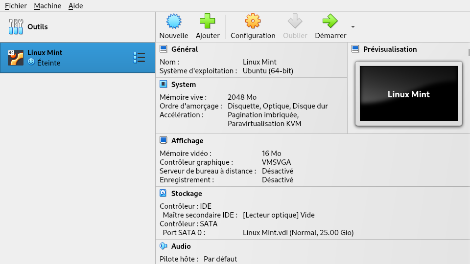 Dans la liste à gauche de l’écran vous devriez voir votre nouvelle machine Linux Mint. Cliquez dessus, puis sur le gros bouton Configuration. Nous allons installer l’image ISO sur la machine virtuelle.