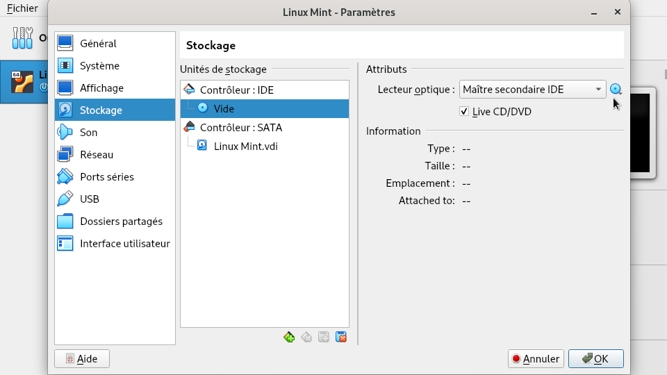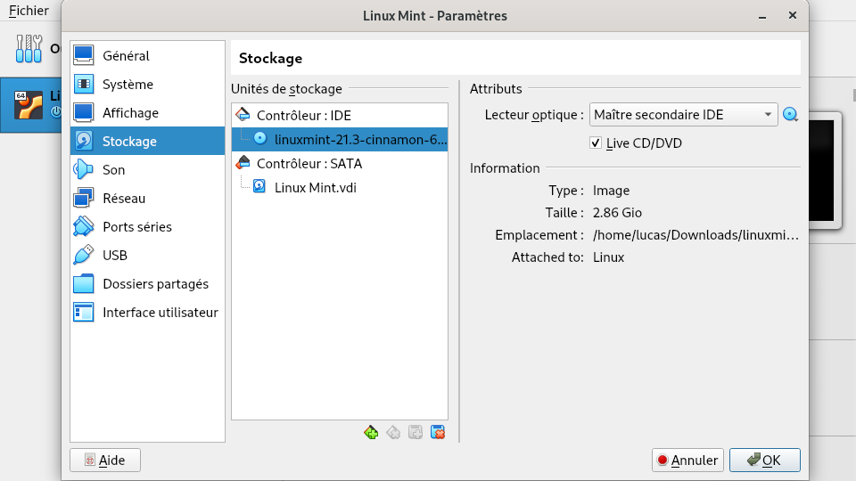 Au bout de Lecteur optique, cliquez sur le petit disque bleu puis sur Choose a disk file.... Dans l’explorateur de fichiers qui s’ouvre, sélectionnez l’image ISO de Linux Mint que vous aviez téléchargée. Vous devriez maintenant voir les informations de votre image ISO s’afficher. Vérifiez que la case Live CD/DVD est cochée puis fermez la fenêtre de configuration.