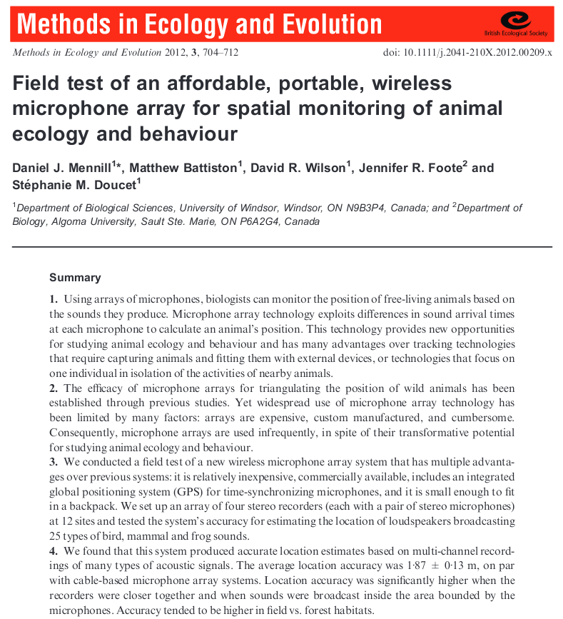 “Field Test of an Affordable, Portable, Wireless Microphone Array for Spatial Monitoring of Animal Ecology and Behaviour.” Methods in Ecology and Evolution 3 (4): 704–12.