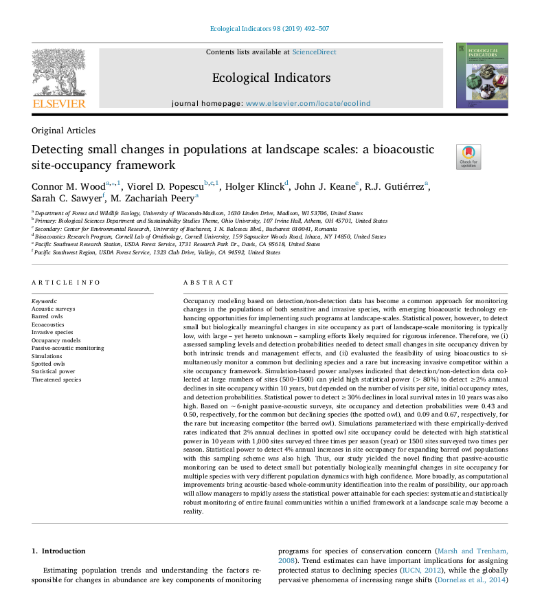 “Detecting Small Changes in Populations at Landscape Scales: A Bioacoustic Site-Occupancy Framework.” Ecological Indicators 98 (March): 492–507.